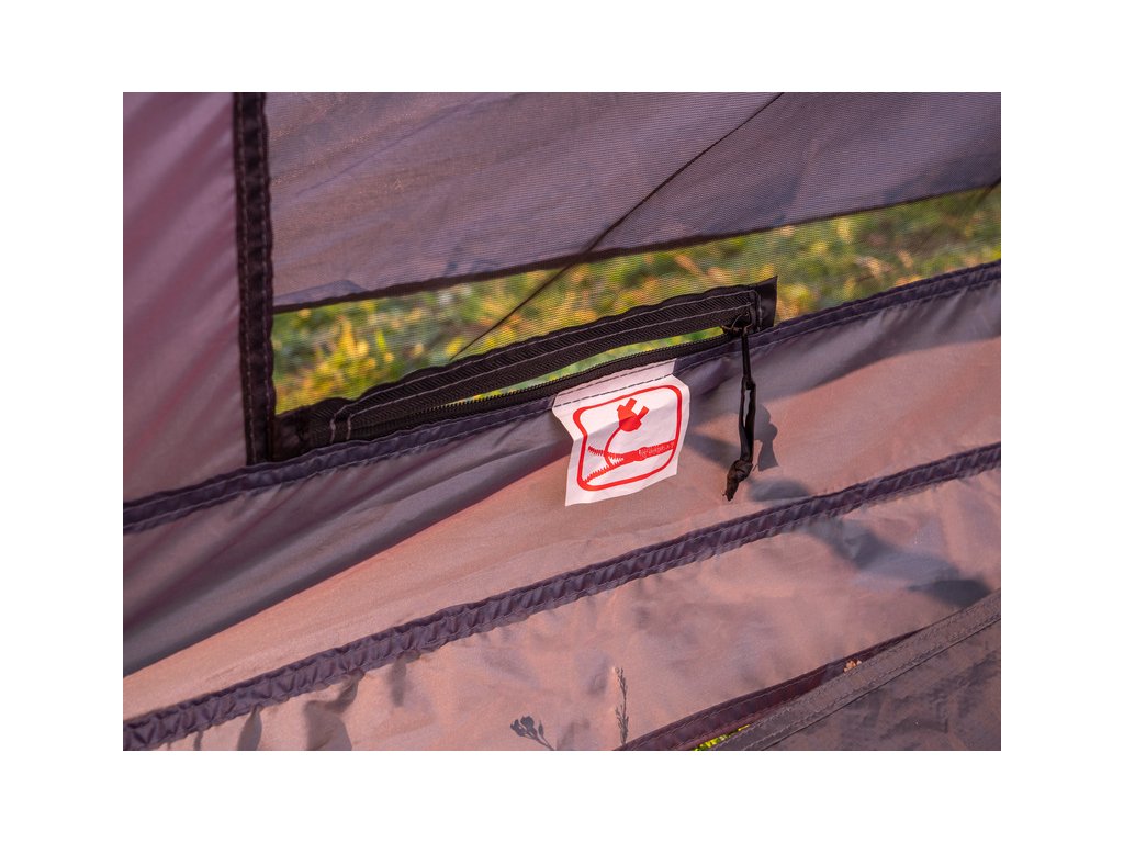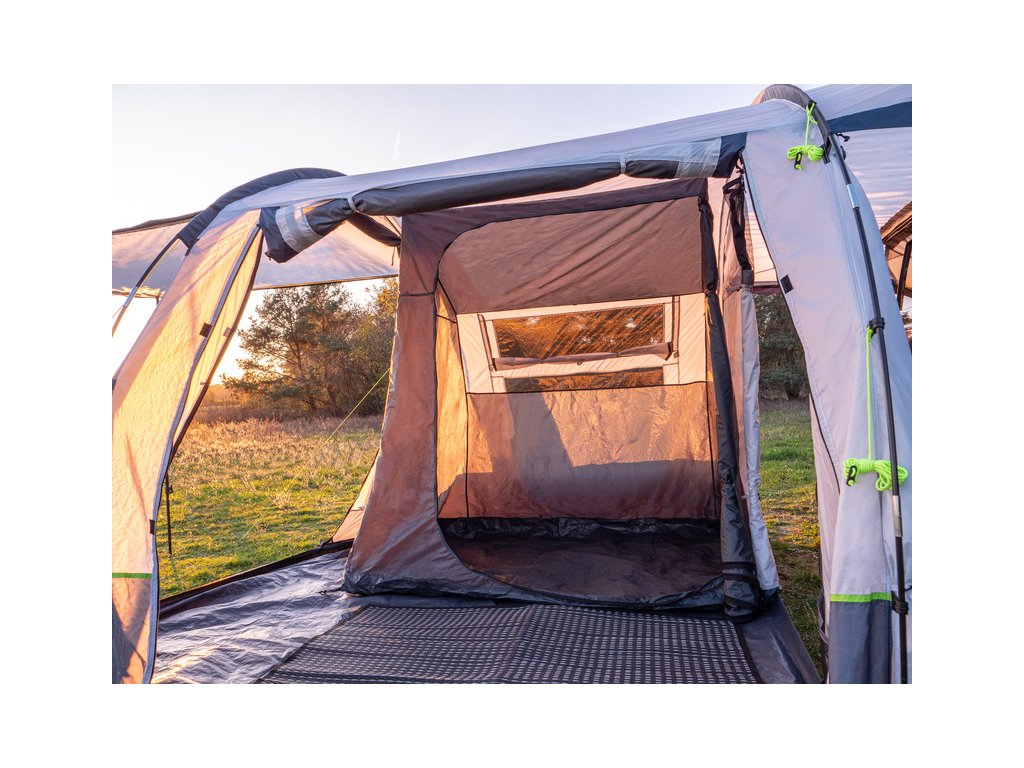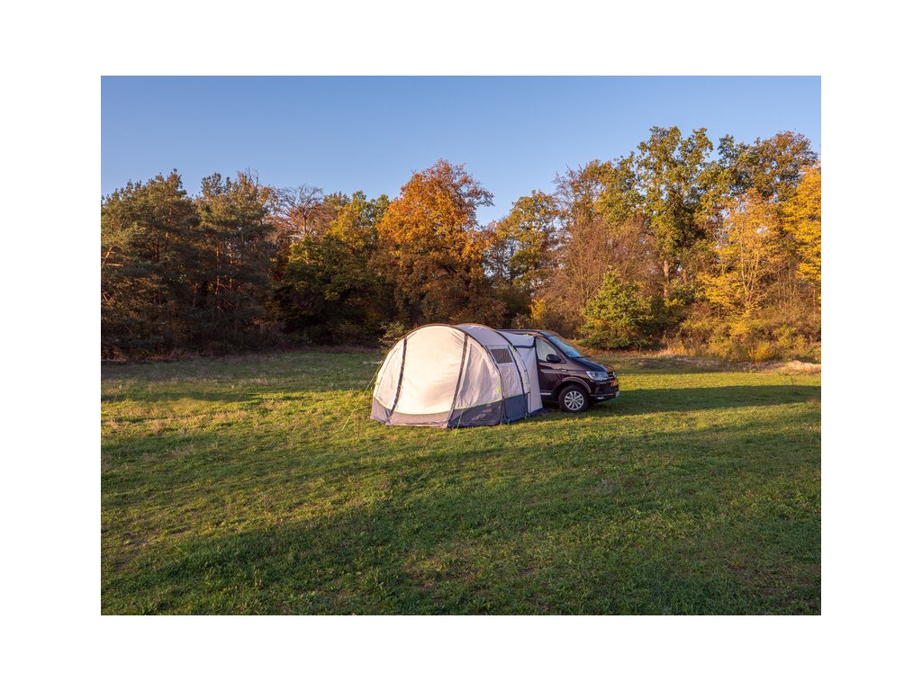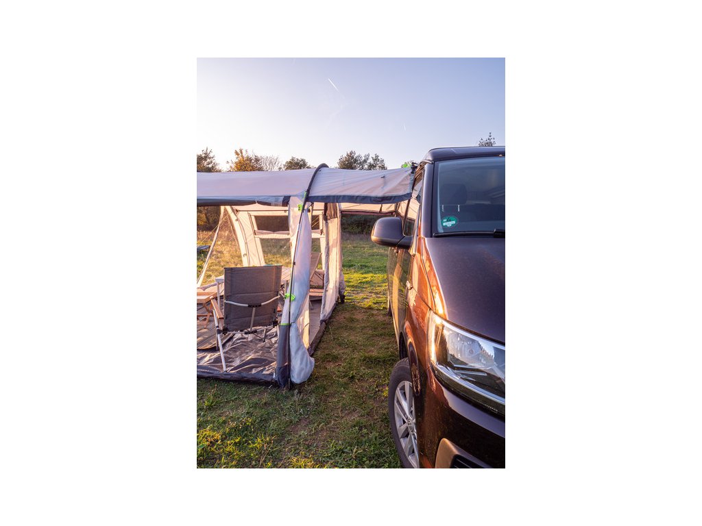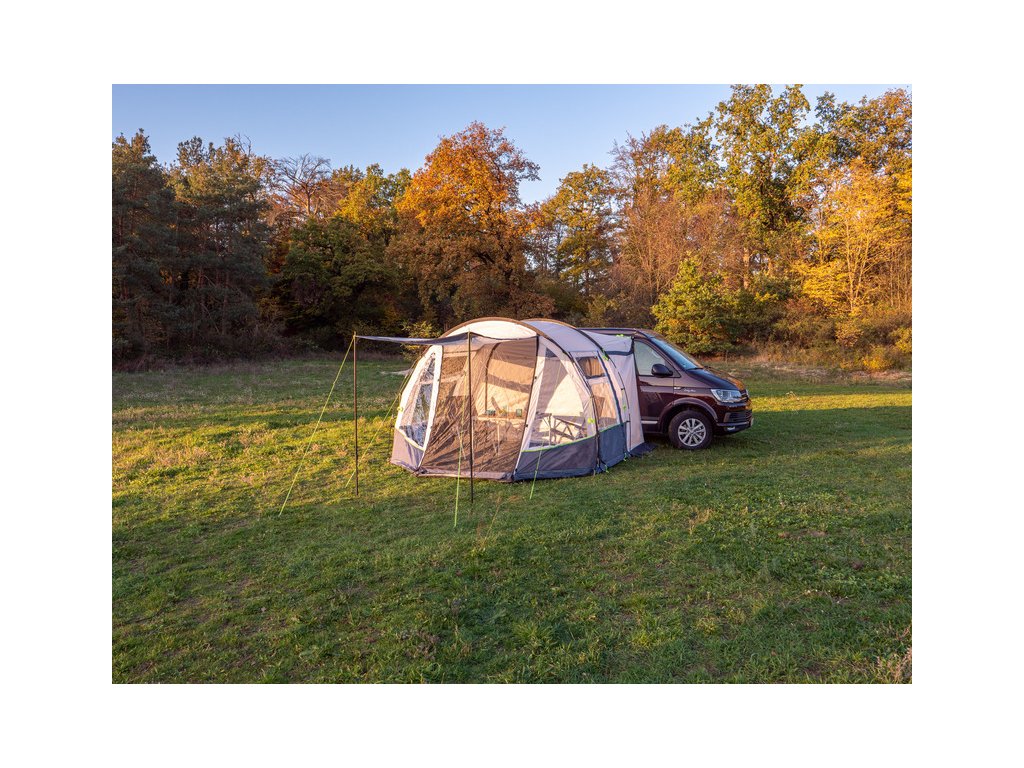 1-tuneľová markíza pre kempingové autobusy s veľkými dverami vpredu s moskytiérou, ktorú možno použiť aj ako slnečnú markízu. S dverami v pravej bočnej stene, ktoré sa dajú zrolovať alebo použiť ako slnečná markíza, a oknom v ľavej bočnej stene a vetracími otvormi v podlahe v oboch bočných stenách. Bočné steny s 1/3 sieťkami proti komárom a 2/3 priehľadnými PVC oknami s vnútorným krytom. Prechodný uzáver do vozidla s dverami na oboch stranách.