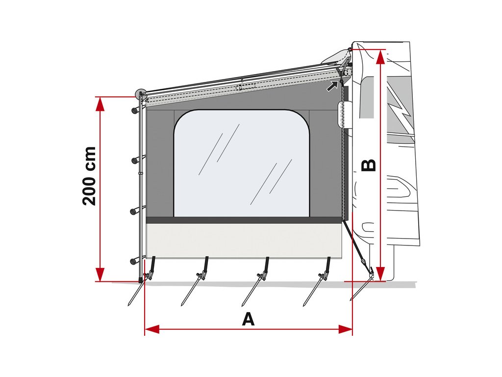 Bočný panel s oknom odolným proti dažďu. Bočný panel s oknom z vodoodpudivého vinylu odolného voči UV žiareniu. Vrátane teleskopickej hliníkovej krokvy a gumových napínačov.Možno použiť pre markízy C-St a F35. Hĺbka A: 210 cm. Výška B: 240-260 cm.