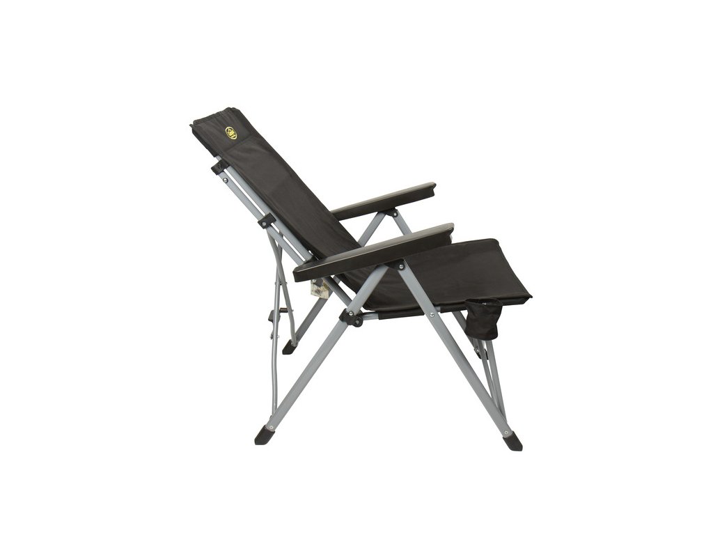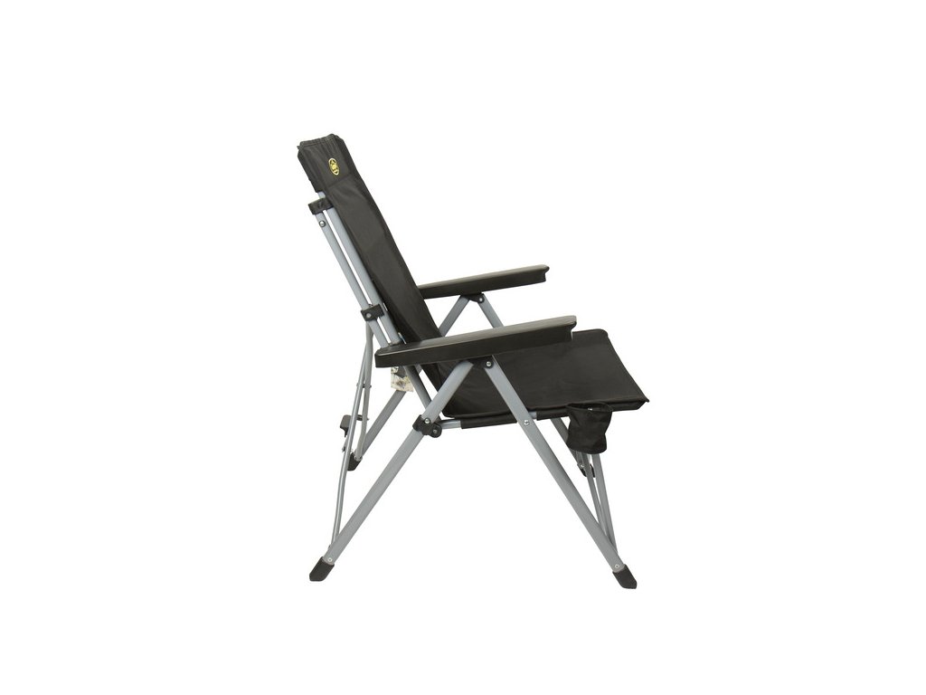 Kempingová stolička s pohodlnými podrúčkami a nastaviteľným operadlom. Bočné vrecko na uloženie fľaše na pitie.