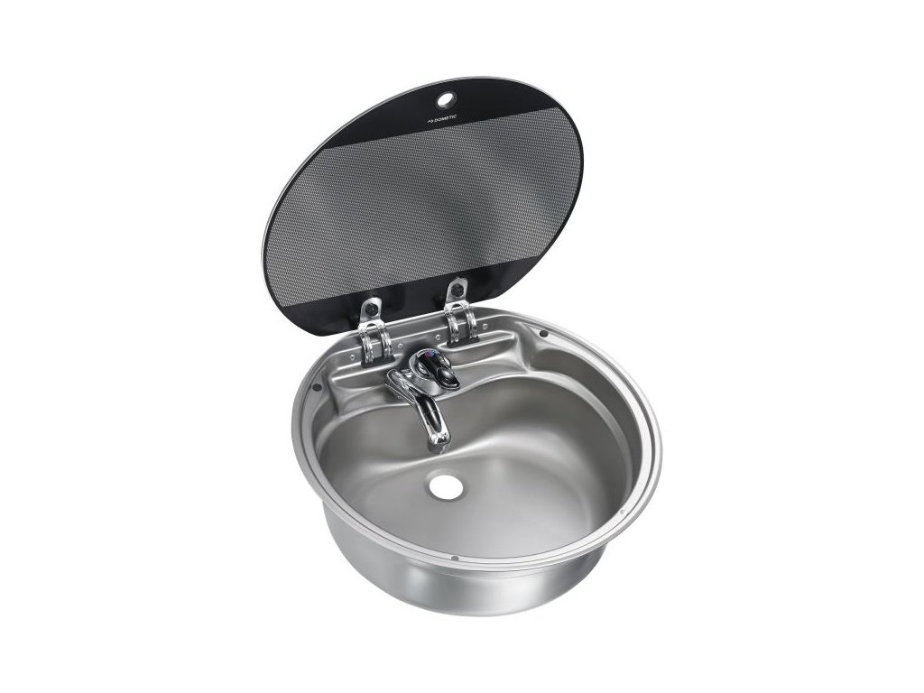 Okrúhly drez z nerezovej ocele so sklopným skleneným vekom do karavanu, obytného vozidla alebo vstavby.