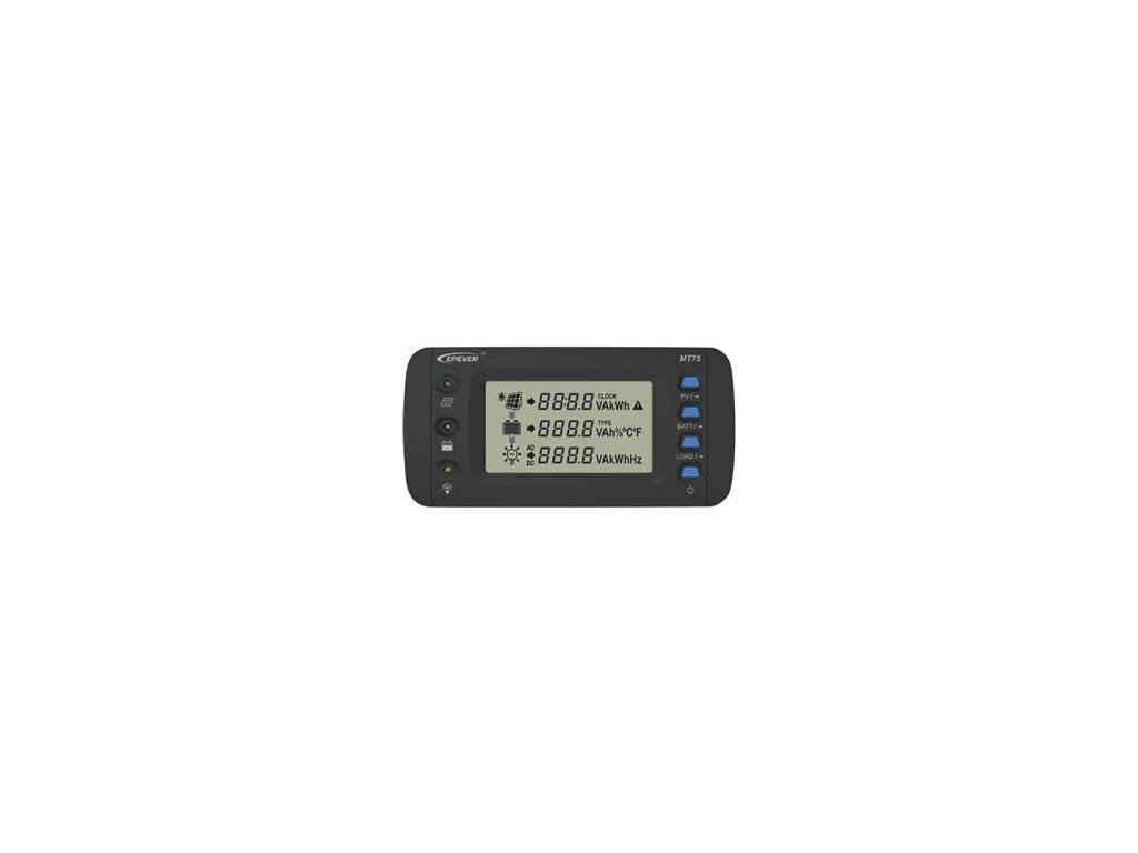 MT75 je diaľkový ovládač novej generácie, ktorý dokáže monitorovať solárny regulátor MPPT a menič napätia súčasne na jednom displeji. Ovládač je kompatibilný so solárnymi regulátormi série MPPT XTRA, sériou MPPT AN a meničmi napätia série IPowerPlus. Vlastnosti:- 4,7-palcový LCD displej na dynamické zobrazovanie údajov systému v reálnom čase- Vizualizácia napätia, prúdu, výkonu a celkovej výroby fotovoltaických článkov- Vizualizácia napätia, prúdu a teploty batérie- Vizualizácia napätia, prúdu, výkonu a celkovej spotreby jednosmernej záťaže- Vizualizácia napätia, prúdu, výkonu a celkovej spotreby striedavej záťaže.Dodatočné parametre