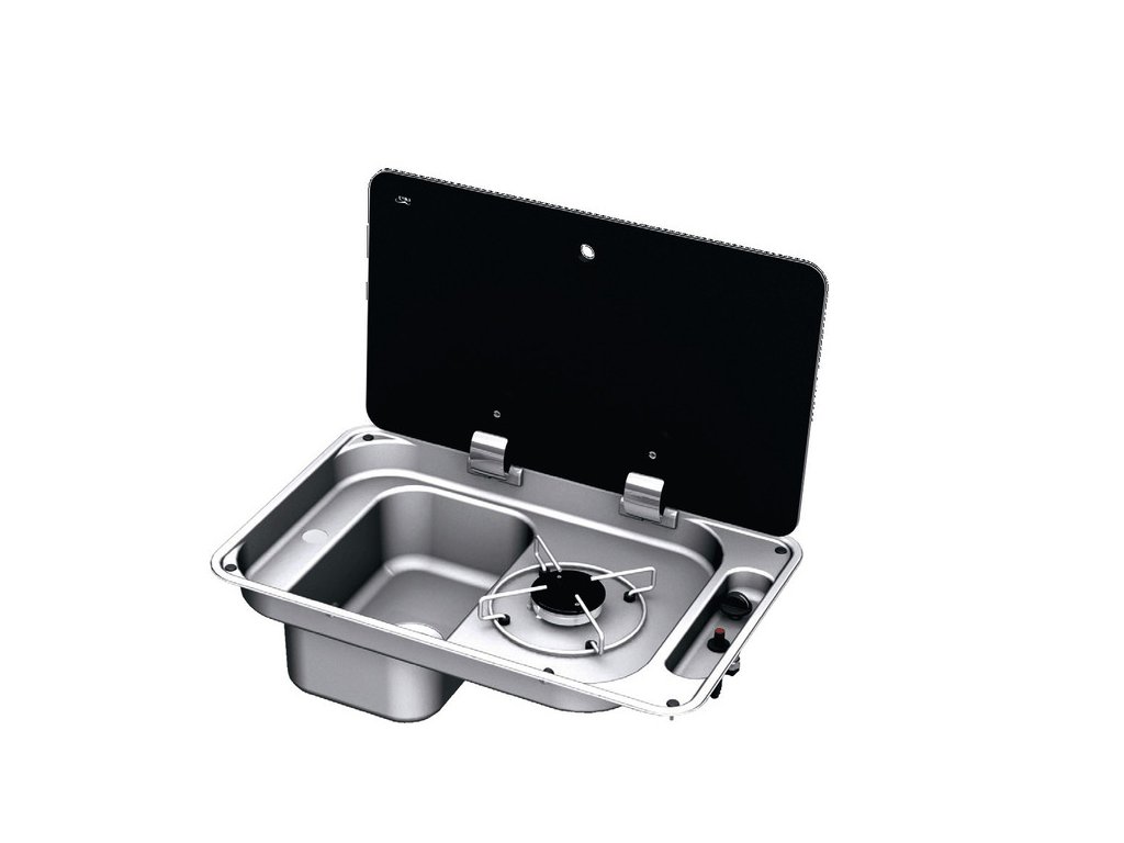 Kombinácia sporáka a drezu s obdĺžnikovým drezom ideálna pre menšie kuchyne.
