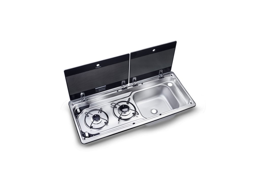 Kombinovaný plynový sporák a drez s celkovými rozmermi Š:760 x V:325 x H:179 mm s dvojdielnym skleneným krytom, 2 plamene.
