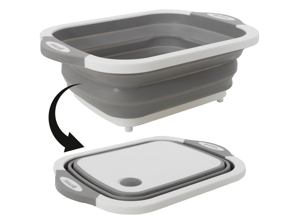 Skladacia umývacia vanička a doska na krájanie v jednom je praktický kuchynský pomocník.