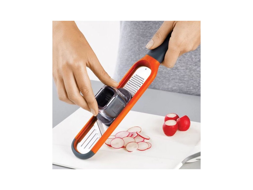 Kompaktné a skladné strúhadlo a krájač z nehrdzavejúcej ocele.