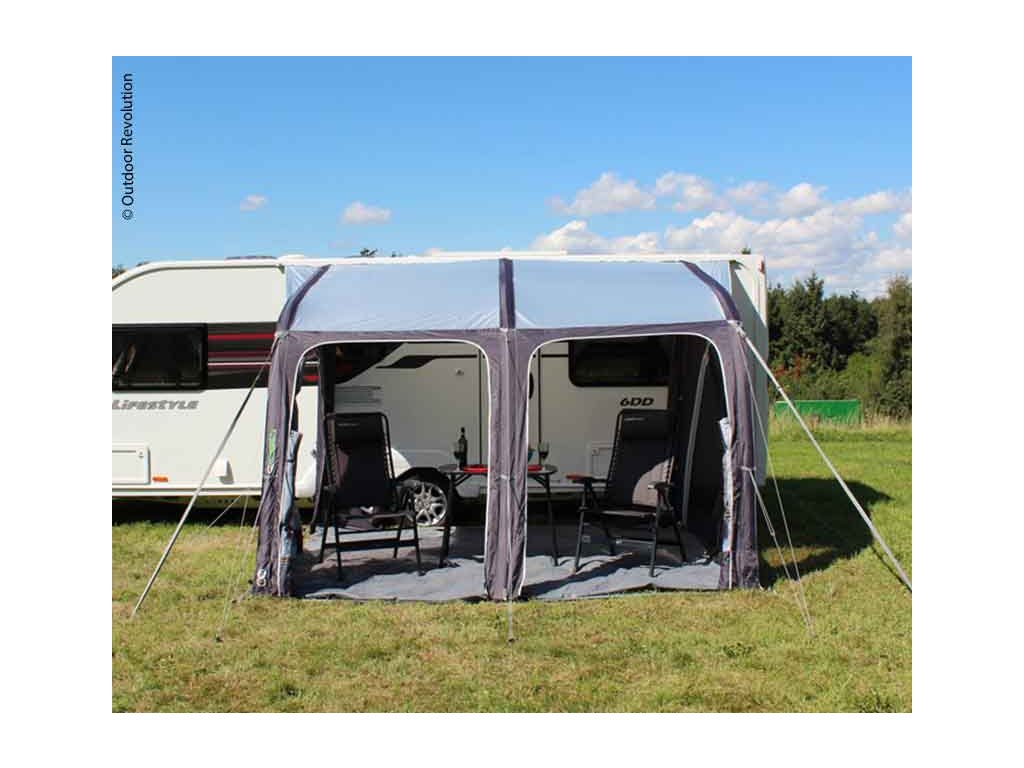 Dva predné panely umožňujú otvorenie a zrolovanie dverí, takže stan možno použiť ako slnečnú markízu. Alebo ich môžete nechať zatvorené pre väčšie súkromie.Dva bočné vchody majú sieťované dvere na zips, ktoré pomáhajú zvýšiť prúdenie vzduchu a znížiť kondenzáciu a zároveň zabraňujú prístupu otravného hmyzu.