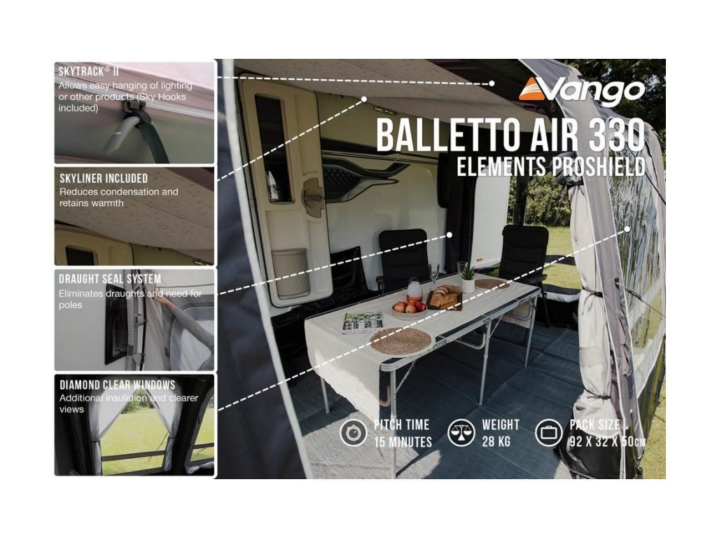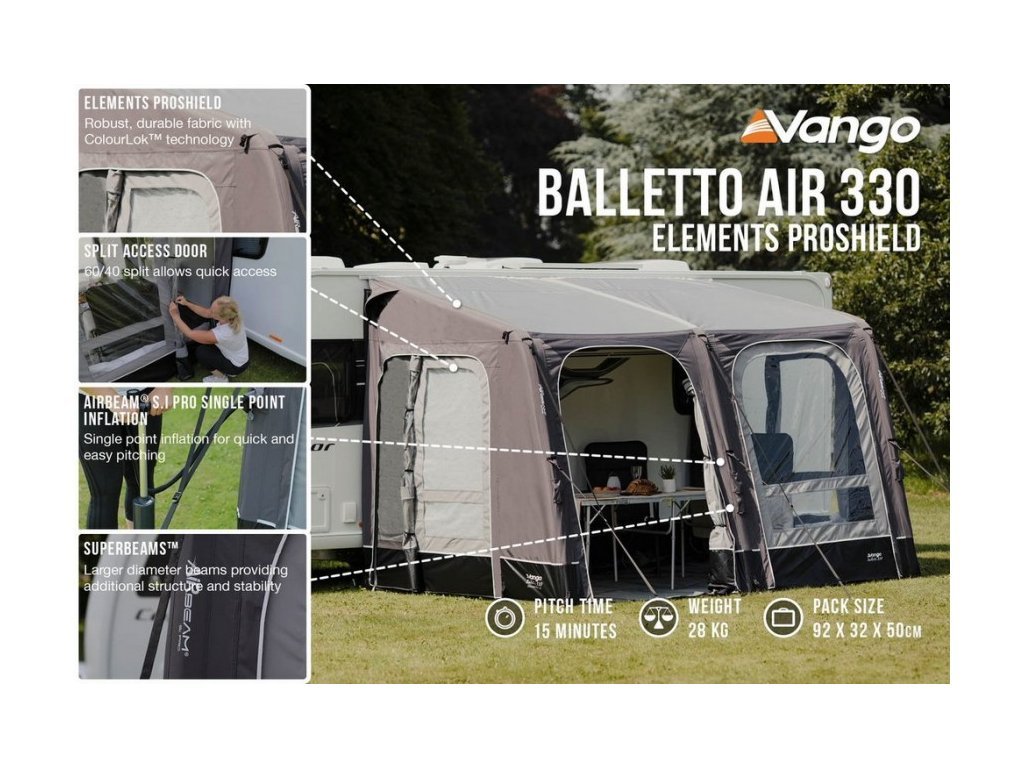 Nafukovací predstav Vango Balletto Air 330 Elements ProShield 330 Shadow Grey je ideálnou voľbou pre Váš karavan. Jednobodové nafukovanie pomocou ventilu AirSpeed S.I Pre zaistí ľahké nafúknutie a vyfúknutie v priebehu niekoľkých minút. Konštrukcia zostane pevná a funkčná aj v prípade prepichnutia.