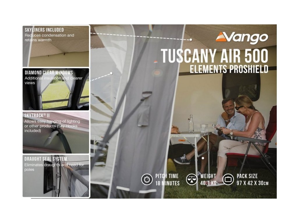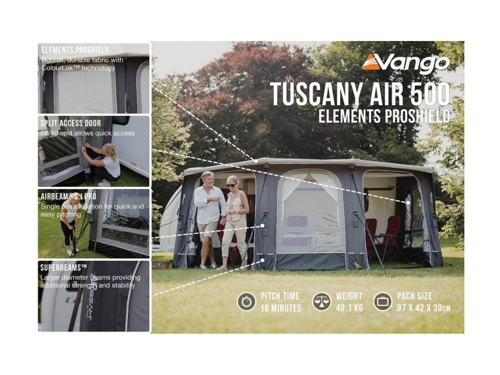 Vango Tuscany Air 500 Elements ProShield Shadow Grey je ideálnou voľbou pre Vašu dovolenku v karavane.Jednobodové nafukovanie pomocou ventilu AirSpeed S.I Pre zaistí ľahké nafúknutie a vyfúknutie v priebehu niekoľkých minút. Konštrukcia zostane pevná a funkčná aj v prípade prepichnutia.
