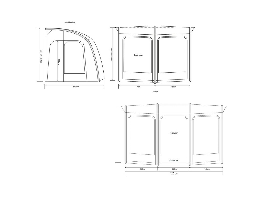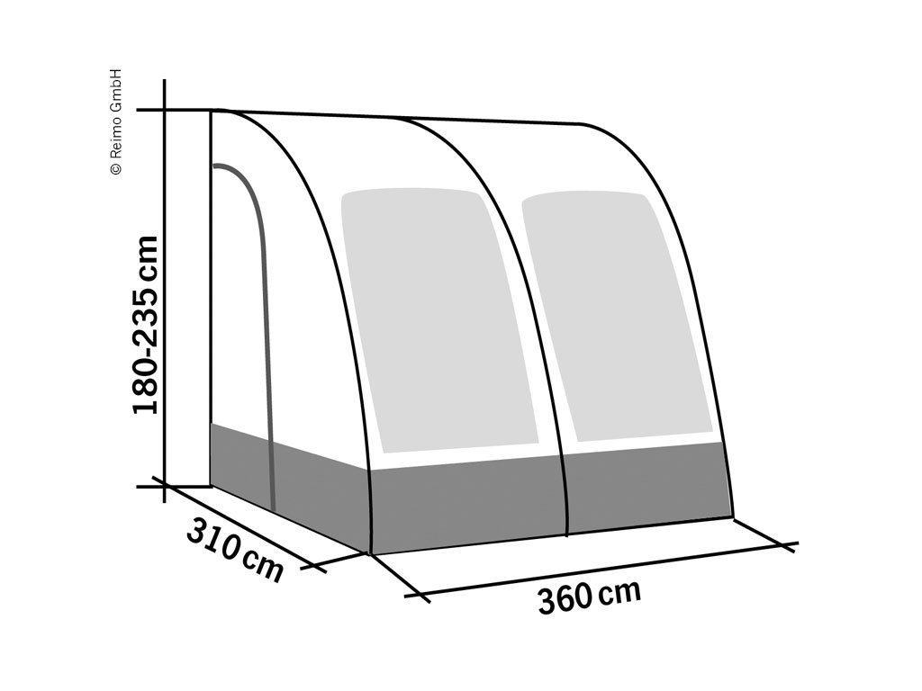 Univerzálna markíza s rámom zo vzduchových rúrok s jedným nafukovacím bodom. Ideálna pre páry a rodiny. S výnimočnou látkou Pro-800HD a mäkkou vnútornou potlačenou strešnou látkou.Predné dvere sa dajú úplne otvoriť, sklopiť alebo sklopiť len na hornú polovicu. Optimálna montáž je možná na oboch stranách.