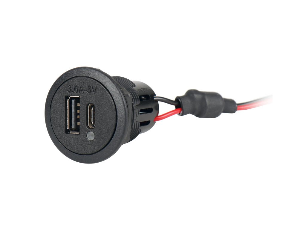 Dvojitá zásuvka USB-C/A 3,6 A s integrovaným meničom napätia a modrou LED diódou. Pripojenie: 1xUSB-C a 1x USB-A, inštalačný otvor Ø28 mm, upevnenie pomocou šesťhrannej matice. Vstup 8-34 V DC. Ochrana proti preťaženiu, ochrana proti prehriatiu, ochrana proti prepólovaniu, ochrana proti skratu. Prepäťová ochrana pre krátke napäťové špičky, predmontované káblové pripojenie, cca 15 cm, 0,5 mm².Dodatočné parametre