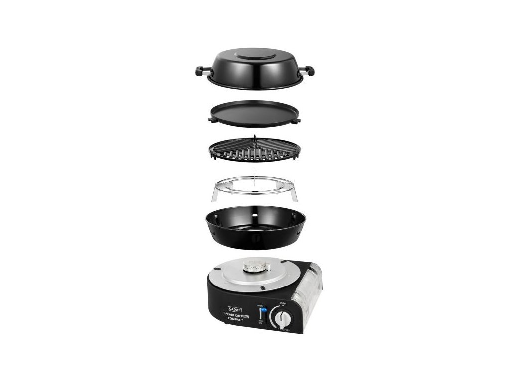 - Napriek svojej malej veľkosti je Safari Chef 30 Compact extrémne univerzálny, pretože má rôzne aplikácie: stojan na panvice a hrnce, grilovaciu dosku, grilovací rošt a pokrievku, ktorú možno použiť aj ako hrniec