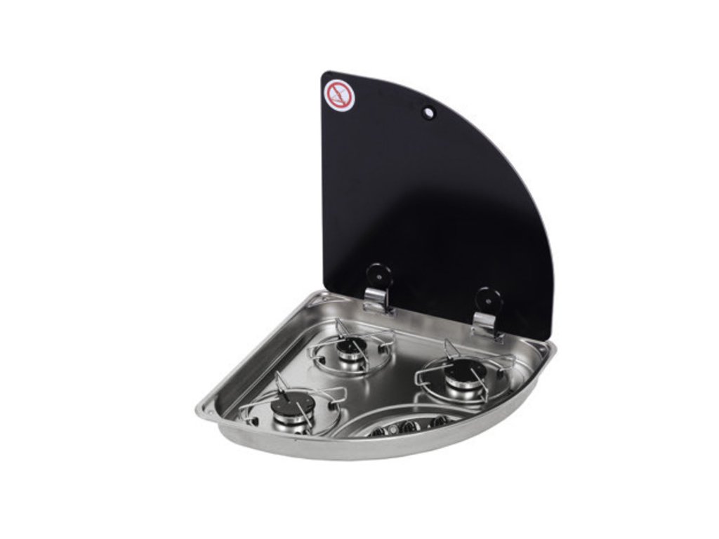 Rohový plynový sporák s 3 horákmi z nehrdzavejúcej ocele s čiernym skleneným krytom.