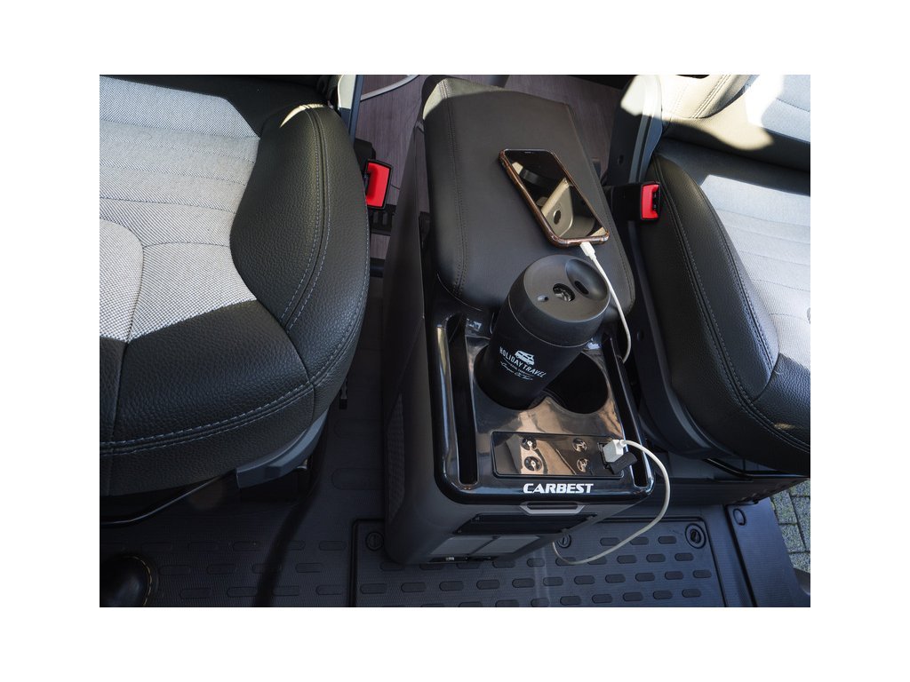 - Multifunkčná stredová konzola s integrovanou chladničkou 12 V / 24 V sa dodáva so samostatnou montážnou doskou na rýchle a jednoduché upevnenie vo vozidle