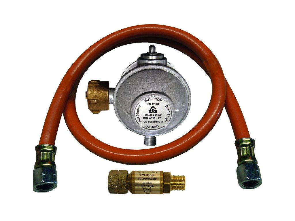 Prípojná súprava GW pre vonkajšiu prevádzku komerčných a súkromných spotrebiteľov.GW 50mbar, 1,5kg/h dvojstupňová ochrana proti prerušeniu pre 90° výstupnú hadicu a MD PVC hadicu. Hmotnosť približne 0,46 kg