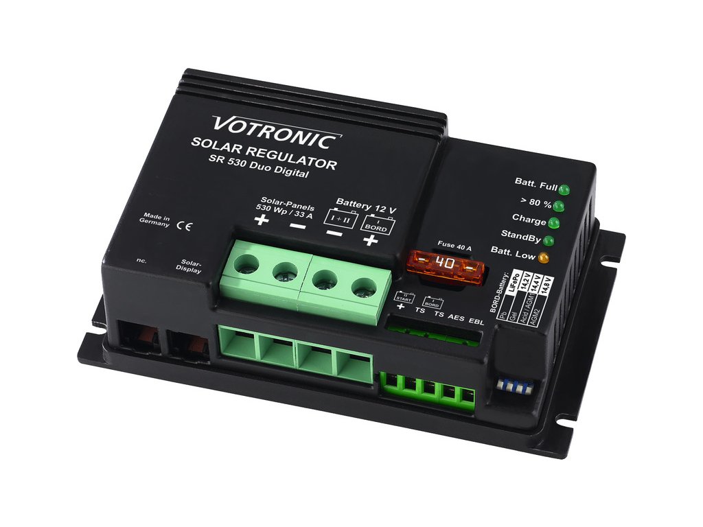 SR 530 Duo Digital. 12 V, výkon solárneho panela 30-530 Wp, nabíjací prúd max. batérie 1: 33 A / batérie 2: 1,5 A. So spínacím výstupom pre chladničku AES. Pripojenie na EBL voliteľné: (objednávka art. 851304), pripojenie pre teplotný senzor voliteľné: (objednávka art. 80181).Dodatočné parametre