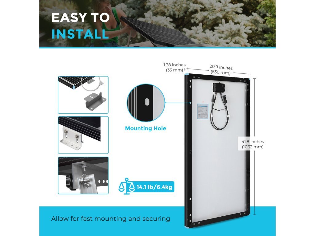 - Kompatibilný s rôznymi Renogy montážnymi systémami, ako sú Z-konzoly, stĺpové držiaky a držiaky pre naklonenie