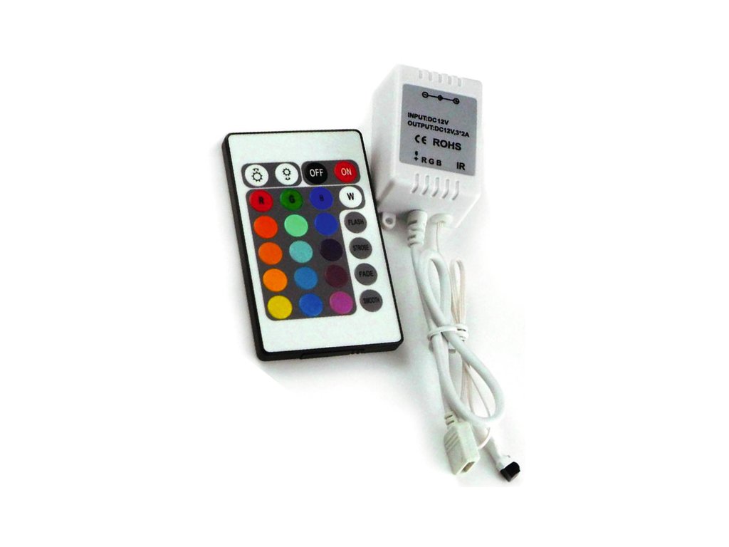 Riadiaca jednotka Carbest RGB s diaľkovým ovládaním a 12 V adaptérom pre svetelný pás RGB. To umožňuje rozsiahle ovládanie svetelného pásu RGB prostredníctvom diaľkového ovládania (svetelné efekty a farba svetla). Vhodné len pre RGB pásy (napr. 831008).