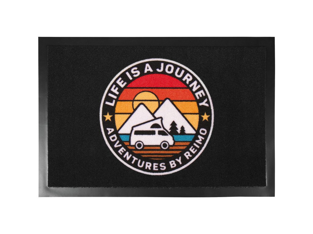 Vstupná rohožka do karavanu, obytného vozidla, vstavby, jachty alebo chalupy. Čierna s potlačou, 60 x 40 cm.