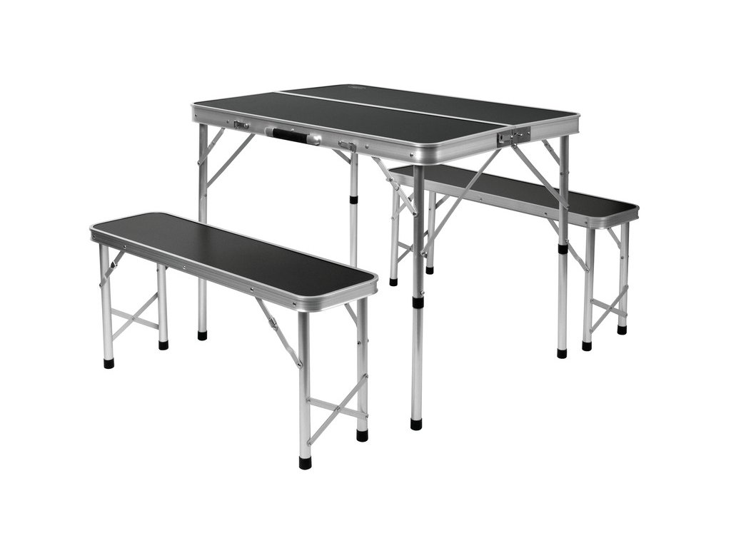 Sedacia súprava so stolom a 2 lavicami sa jednoducho zloží ako kufor, keď sú lavice umiestnené v stole.