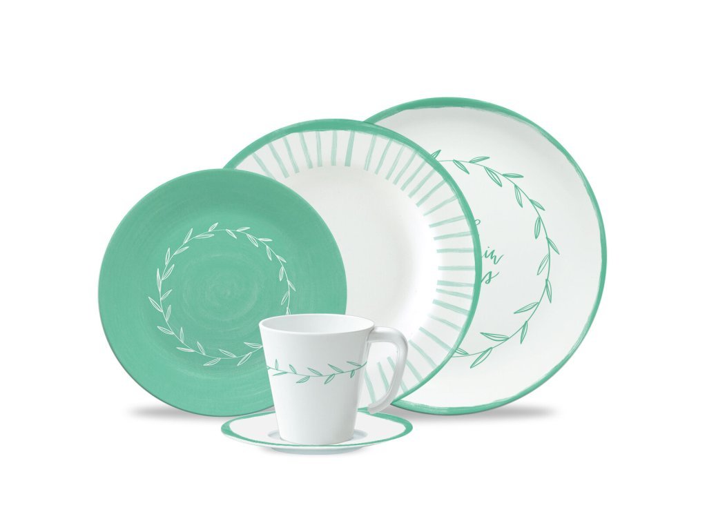 Trendy sada riadu pre štyri osoby je vyrobená z melamínu, ktorý je obzvlášť odolný proti nárazom.