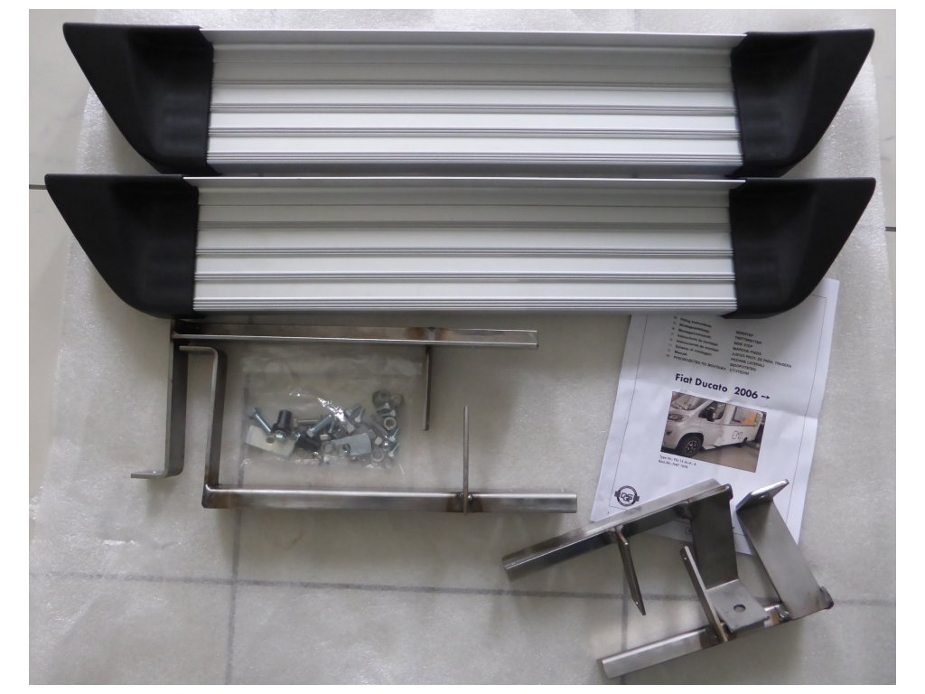 Schodíky pre Fiat Ducato od roku 2006 a identické modely. Hliníkovýprofil so skrutkovaným plastovým bezpečnostným krytom na koncoch a protišmykovým profilom. Sadavoľných schodíkov sa pevne priskrutkuje k stĺpiku vozidla a pod neho pomocou špeciálnych a dodávaných držiakov z nehrdzavejúcej ocele.