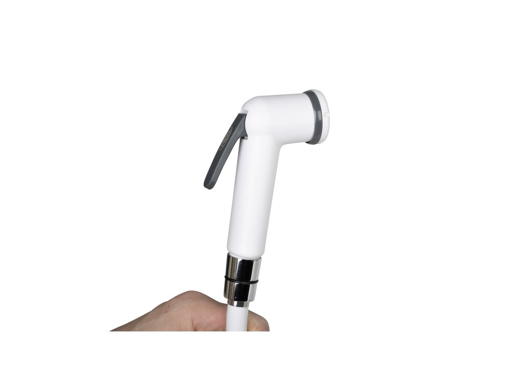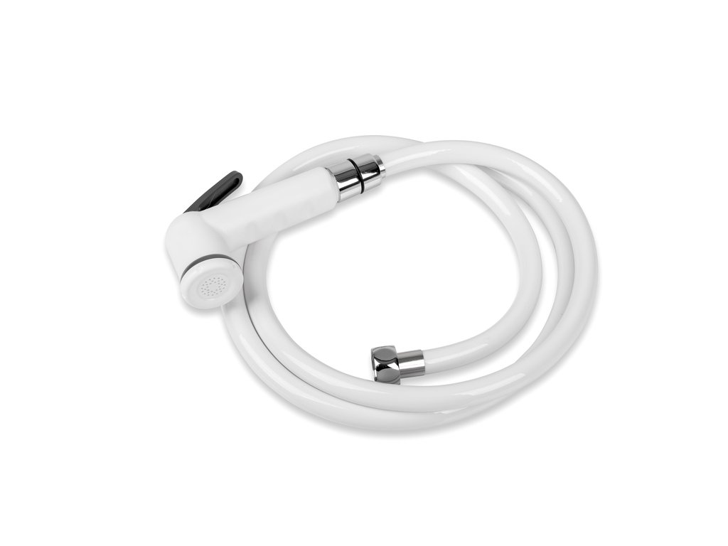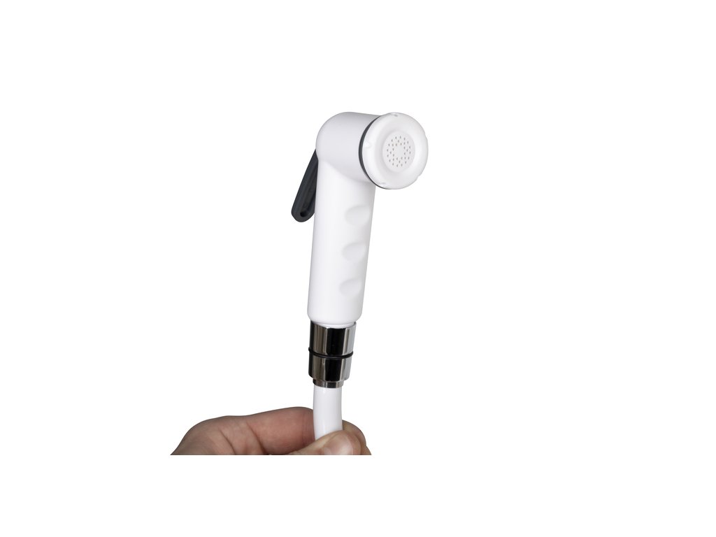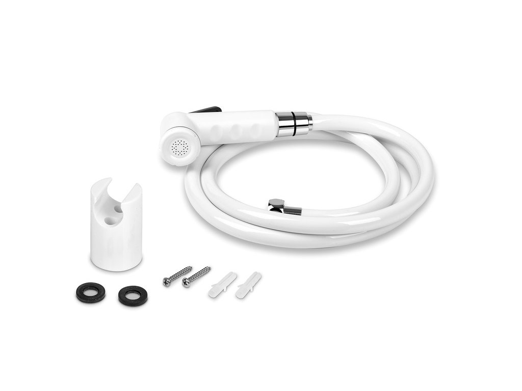 Biela sprchová súprava vhodná pre karavan, obytný automobil, jachtu alebo chatu.