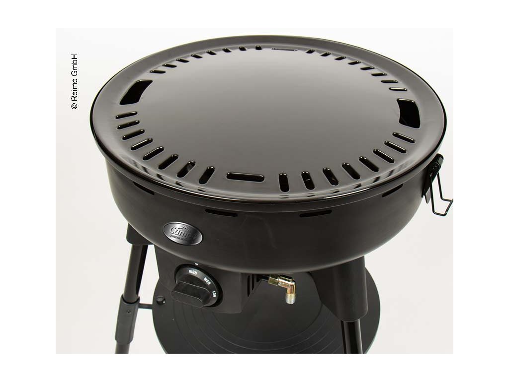 Kempingový plynový gril Camp4 s 3 výškovo nastaviteľnými kovovými nohami, ktoré sa pripevňujú na plastové nožičky