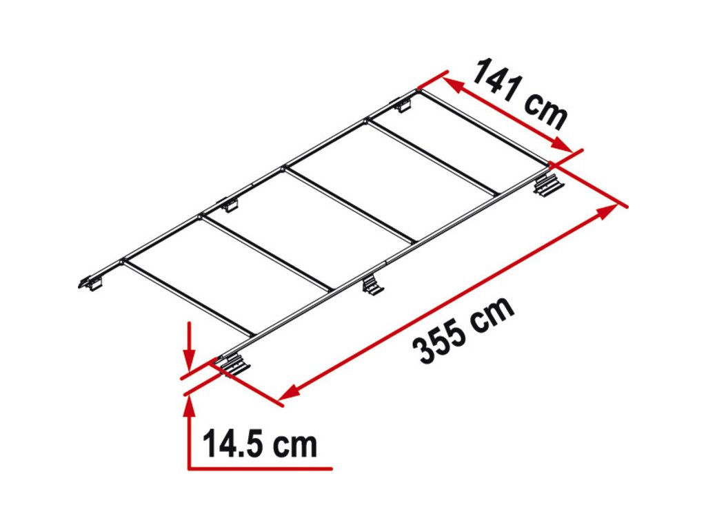 Strešný nosič vrátane adaptéra pre markízu Fiamma F65. Dĺžka: 355 cm.Montáž na pôvodné body na streche. Montáž bez vŕtania. Strešnú markízu Fiamma F65 možno namontovať na ľavú alebo pravú stranu. Pre markízu: ľavostranná montáž, je potrebný adaptér 43464.Dodatočné parametre