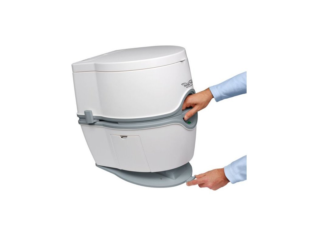- Toaleta Porta Potti je bezpečne pripevnená k podlahovej doske a možno ju od nej odpojiť v jednom jednoduchom kroku